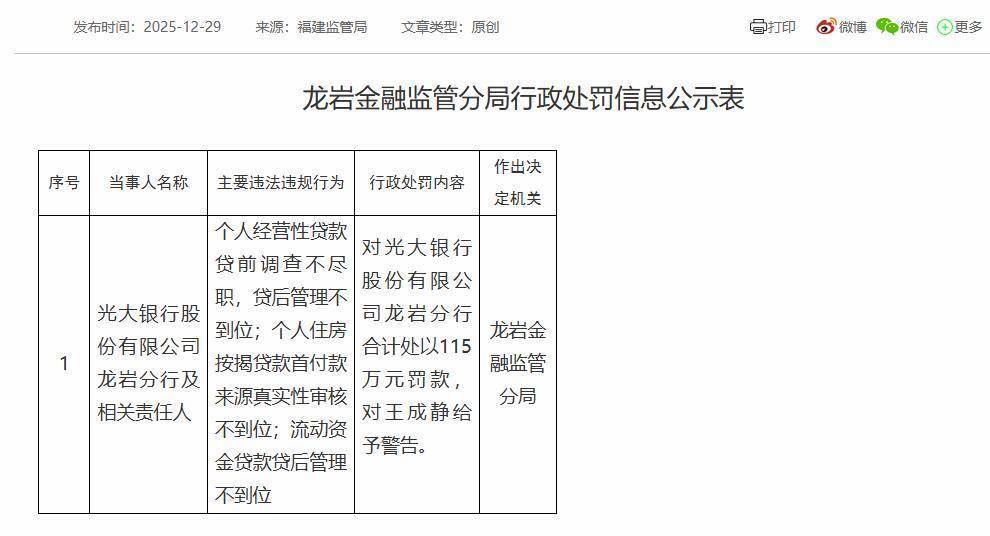 龙岩金融监管分局对光大银行股份有限公司龙岩分行合计处以115万元罚款,对王成静给予警告。